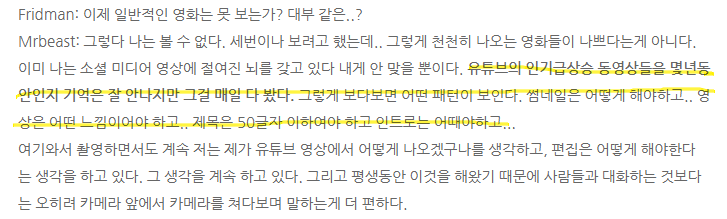 유튜브 구독자 1억 3천만명의 Mr.Beast 인터뷰 내용 중 본문