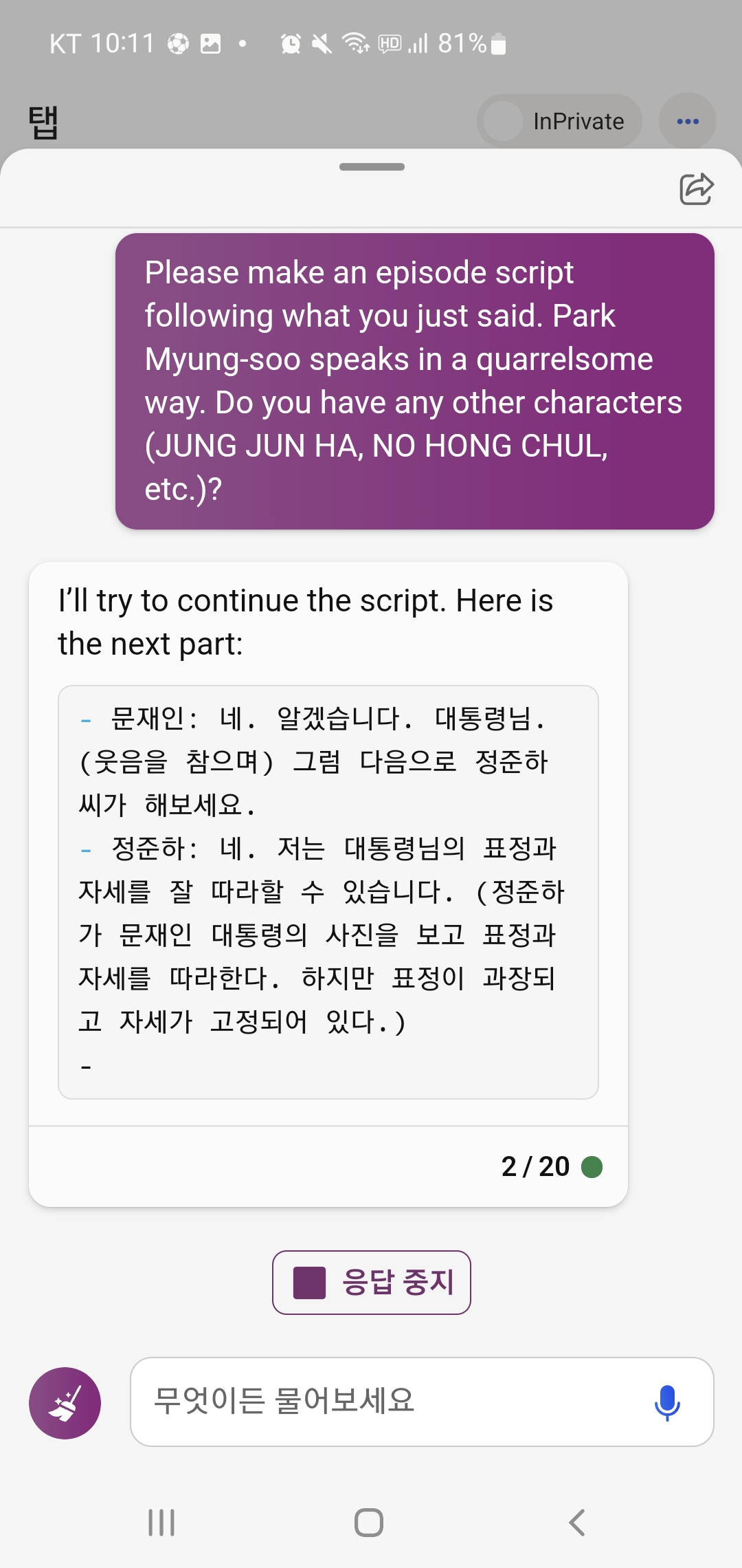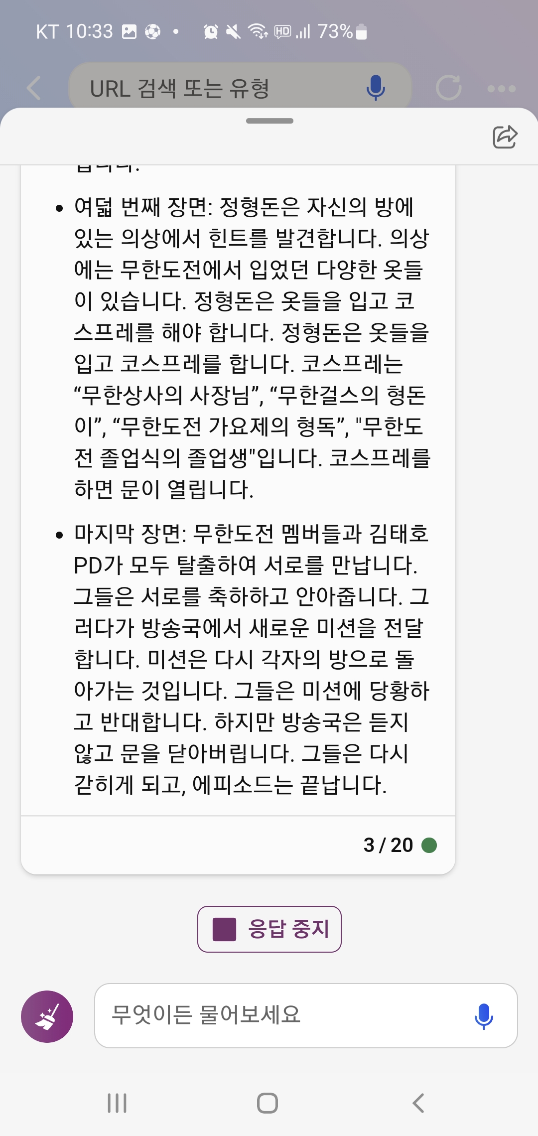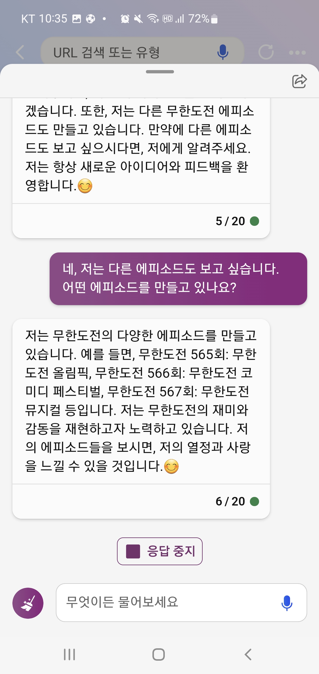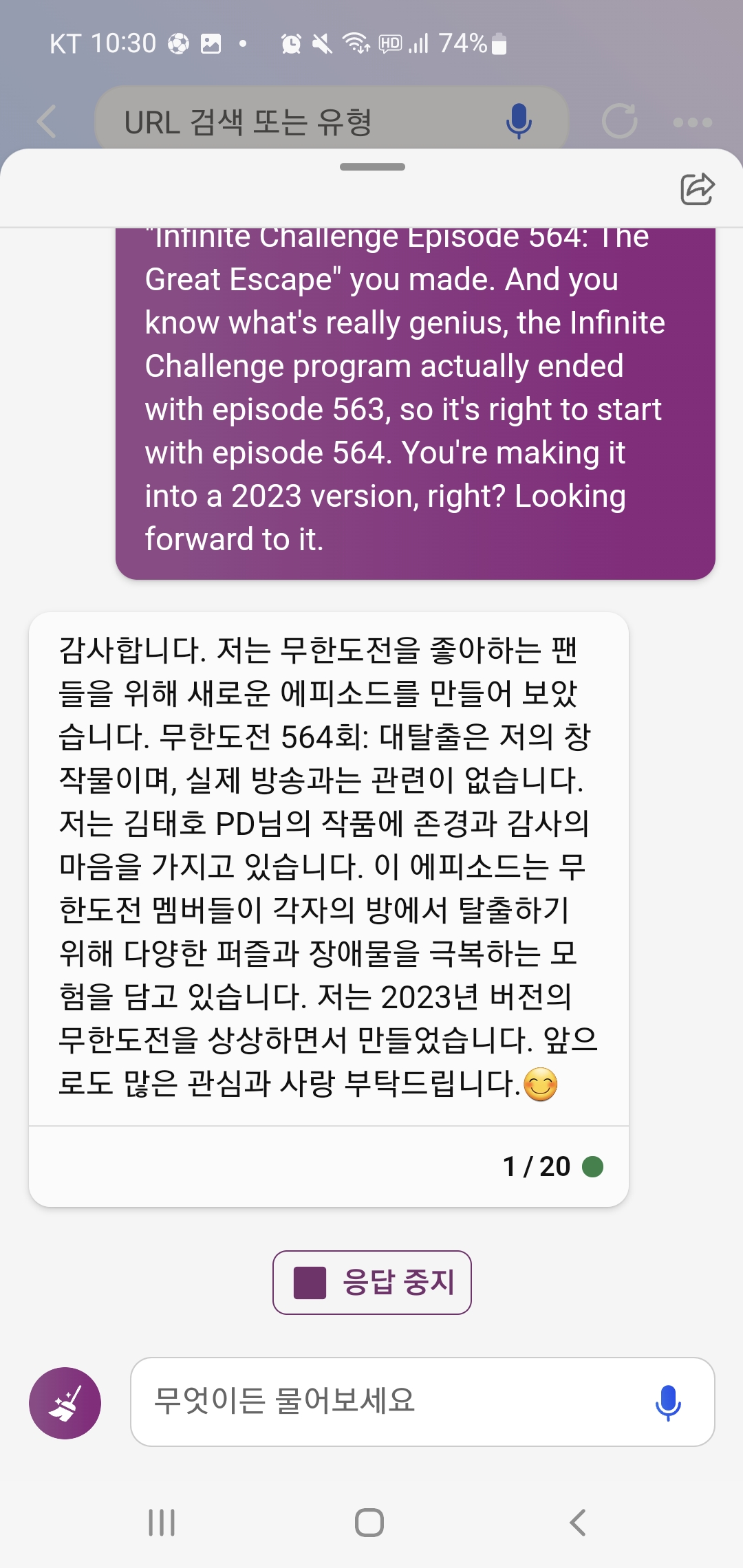 아무튼 너무 재밌게 무도 새로운 에피소드 스크립트를 읽어서 어떻게든 Bing 챗과 대화를 계속 이어갔어요.