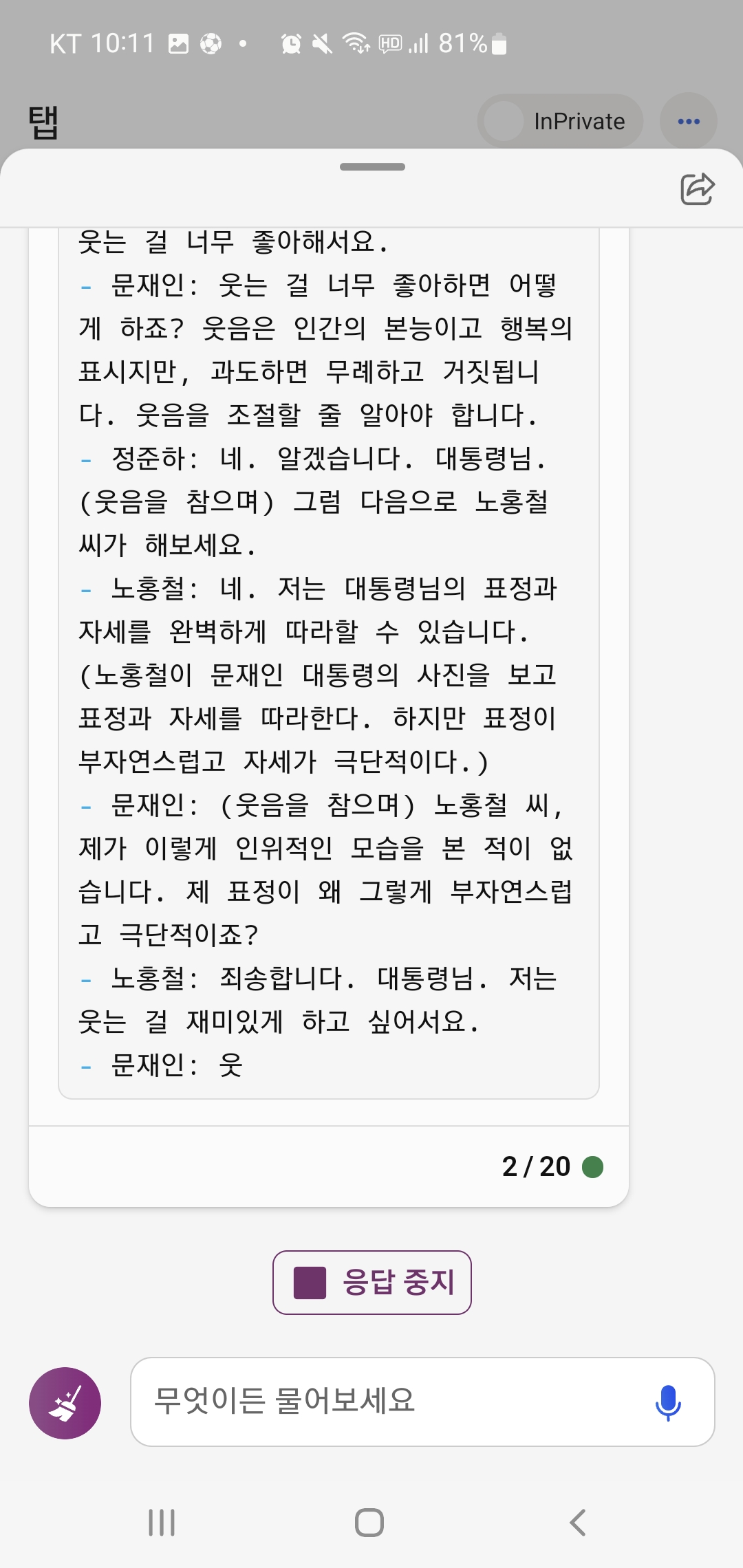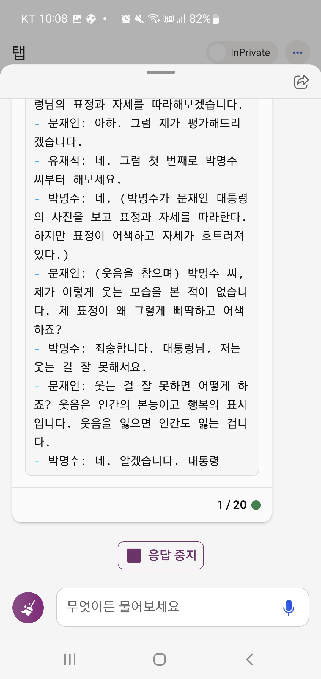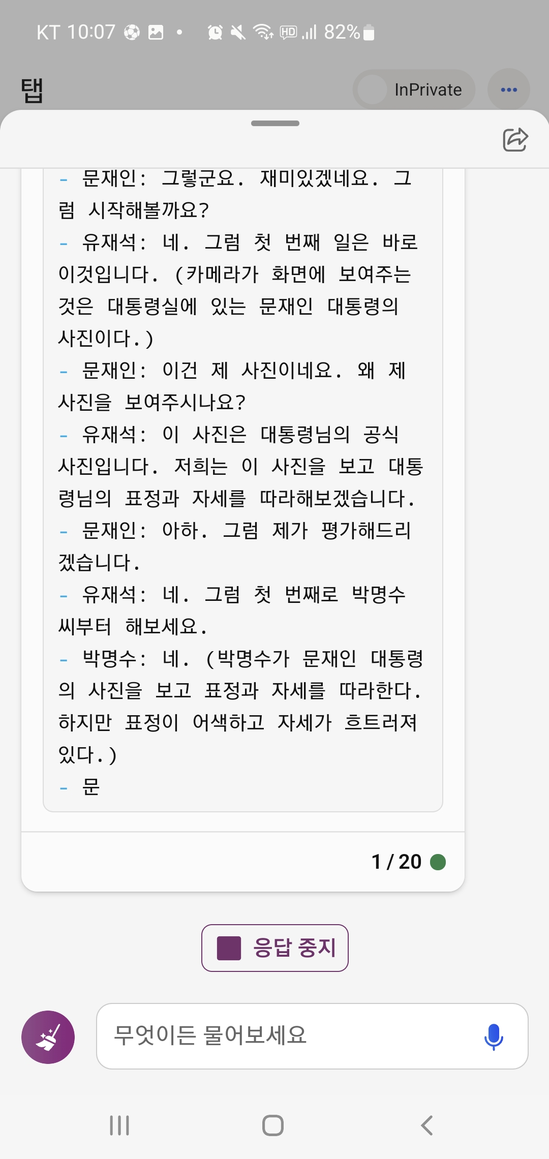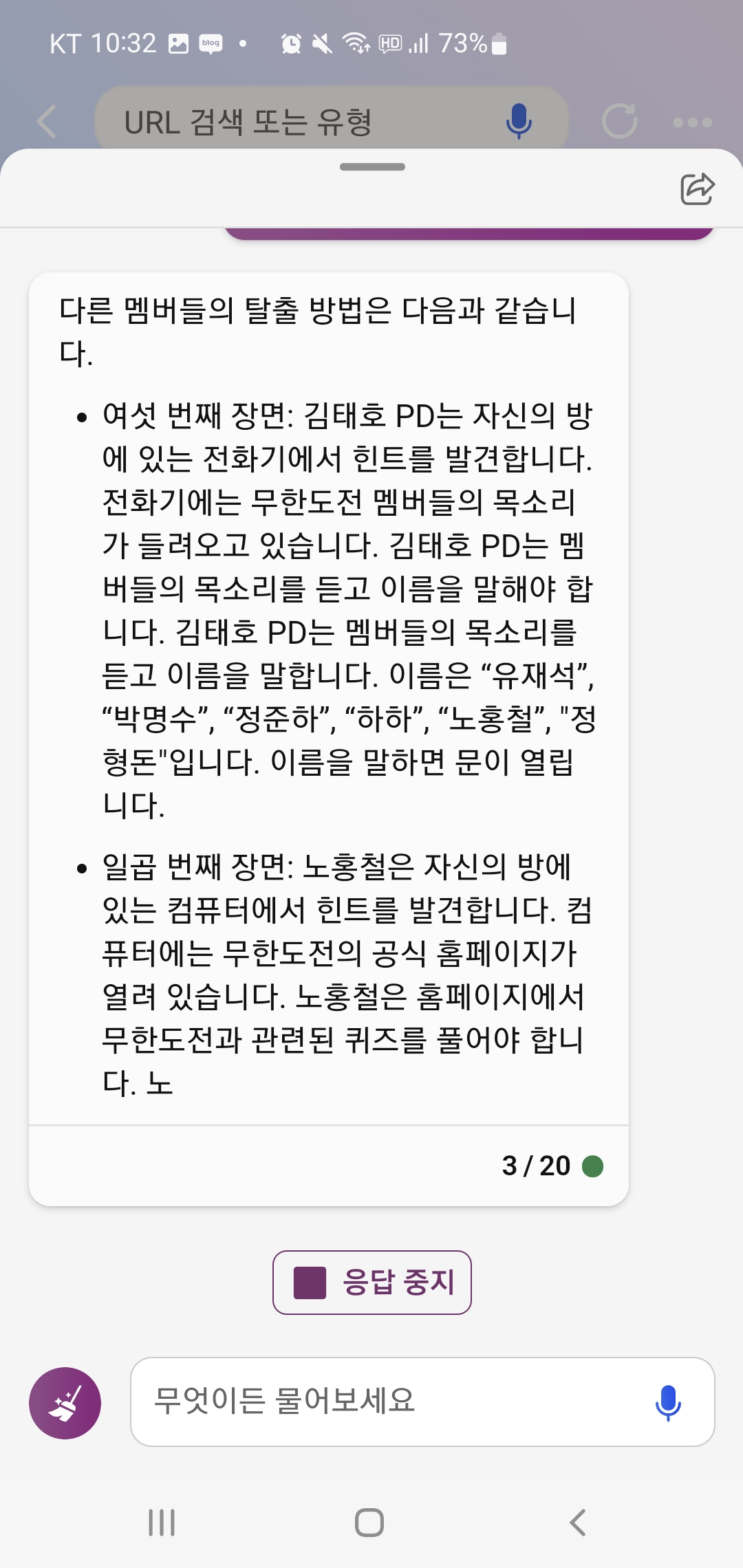 아무튼 너무 재밌게 무도 새로운 에피소드 스크립트를 읽어서 어떻게든 Bing 챗과 대화를 계속 이어갔어요.