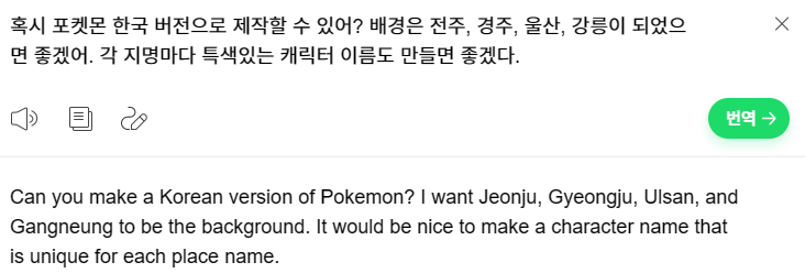 이번엔 포켓몬도 한국 버전으로 만들어달라고 빙챗봇에 요청해봤습니다.