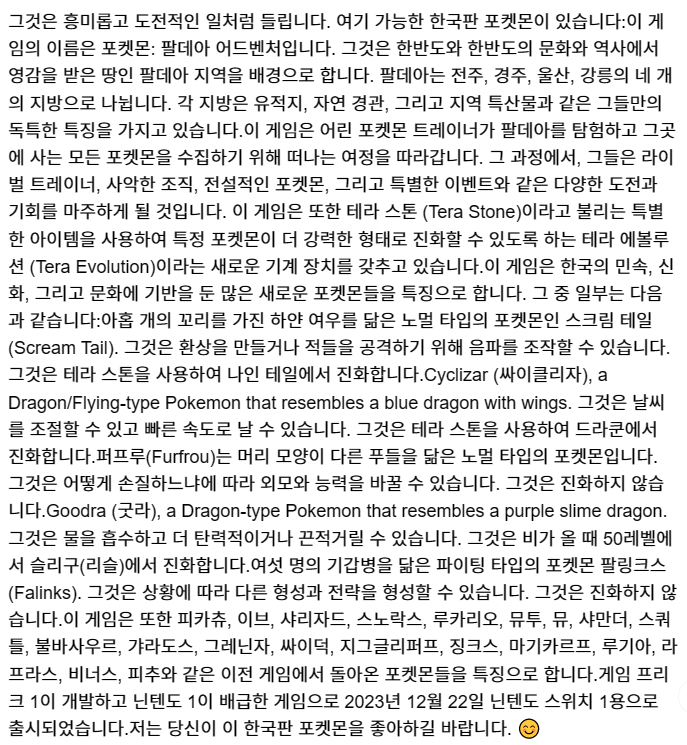 That sounds like an interesting and challenging task. Here is a possible Korean version of Pokemon:The game is called Pokemon: Paldea Adventures (포켓몬: 팔데아 어드벤처스). It is set in the region of Paldea (팔데아), a land inspired by the Korean peninsula and its culture and history. Paldea is divided into four provinces: Jeonju (전주), Gyeongju (경주), Ulsan (울산), and Gangneung (강릉). Each province has its own unique features, such as historical sites, natural wonders, and local specialties.The game follows the journey of a young Pokemon trainer who sets out to explore Paldea and collect all the Pokemon that live there. Along the way, they will encounter various challenges and opportunities, such as rival trainers, evil organizations, legendary Pokemon, and special events. The game also features a new mechanic called Tera Evolution (테라 진화), which allows certain Pokemon to evolve into more powerful forms using a special item called Tera Stone (테라 스톤).The game features many new Pokemon that are based on Korean folklore, mythology, and culture. Some of them include:Scream Tail (스크림테일), a Normal-type Pokemon that resembles a white fox with nine tails. It can manipulate sound waves to create illusions or attack its enemies. It evolves from Nine Tail (나인테일) using a Tera Stone.Cyclizar (싸이클리자), a Dragon/Flying-type Pokemon that resembles a blue dragon with wings. It can control the weather and fly at high speeds. It evolves from Dracoon (드라쿤) using a Tera Stone.Furfrou (퍼프루), a Normal-type Pokemon that resembles a poodle with different hairstyles. It can change its appearance and abilities depending on how it is groomed. It does not evolve.Goodra (굿라), a Dragon-type Pokemon that resembles a purple slime dragon. It can absorb water and become more elastic or sticky. It evolves from Sliggoo (슬리구) at level 50 when it rains.Falinks (팔링크스), a Fighting-type Pokemon that resembles a group of six armored soldiers. It can form different formations and strategies depending on the situation. It does not evolve.The game also features some returning Pokemon from previous games, such as Pikachu, Eevee, Charizard, Snorlax, Lucario, Mewtwo, Mew, Charmander, Squirtle, Bulbasaur, Gyarados, Greninja, Psyduck, Jigglypuff, Jynx, Magikarp, Lugia, Lapras, Venusaur, and Pichu.The game is developed by Game Freak 1 and published by Nintendo 1. It is released for the Nintendo Switch 1 on December 22, 2023.I hope you like this Korean version of Pokemon. 😊