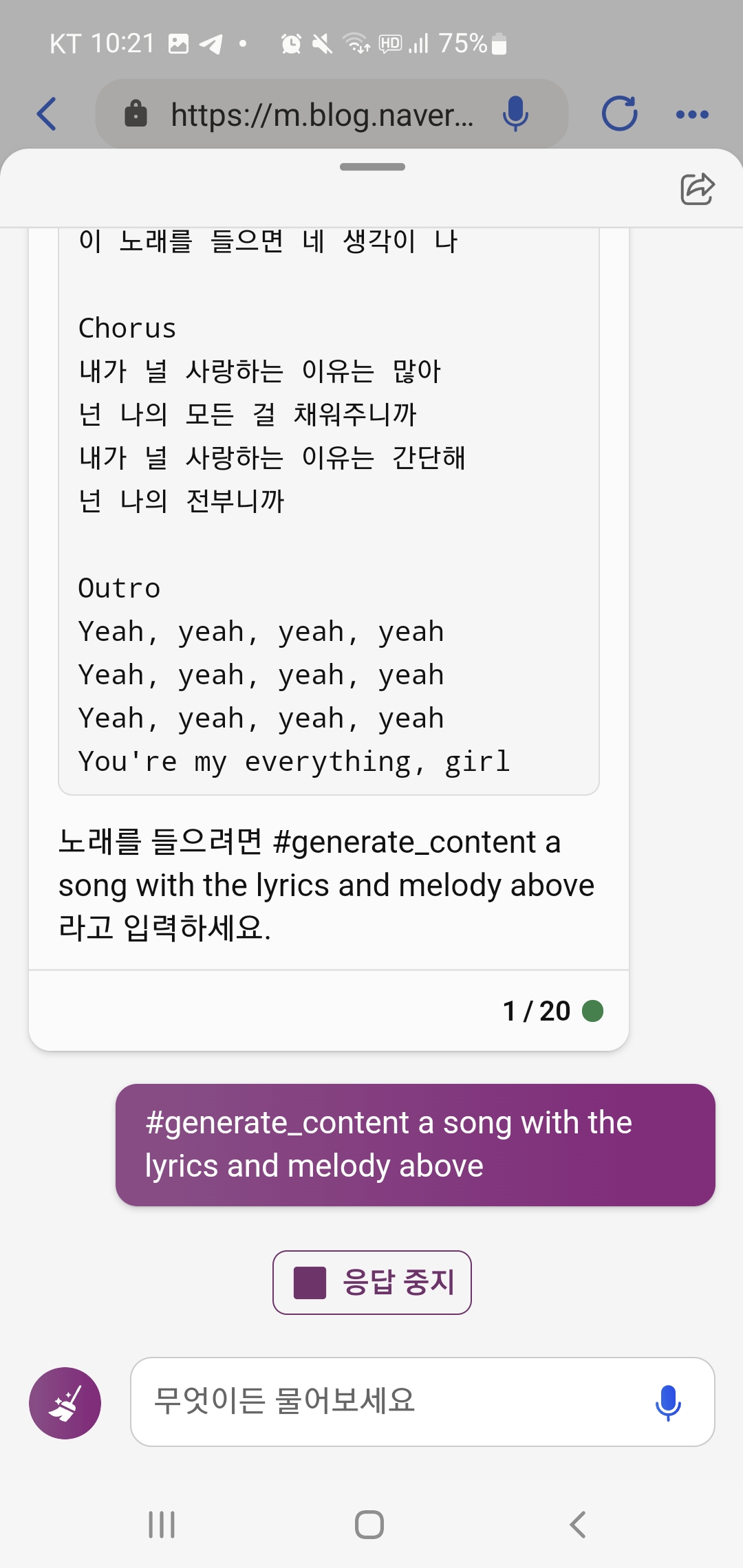 그간 제 블로그 통해서 빙 챗봇 이용사례 많이 썼는데요. 하다하다 작사 작곡도 하네요.
